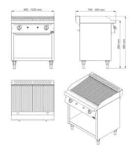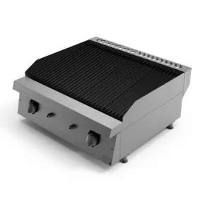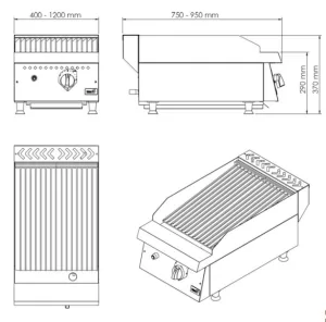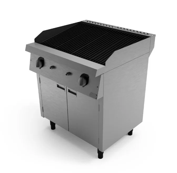 • Construção em Aço Inox • Sistema de aquecimento a gás (GLP – Gás Liquefeito de petróleo ou GN – Gás Natural) com acendimento externo por chama piloto • Painel frontal em aço inox com manípulos em baquelite (controle de vazão de gás gradual mínimo a máximo) • Grelhas removíveis em ferro fundido • Canal coletor de gordura posicionado na frente da chapa • Gaveta coletora de resíduos em aço inox • Queimadores tubulares em aço esmaltado • Solda em atmosfera de argônio do tipo TIG com perfeito acabamento dos cantos – facilidade na higienização • Pés niveladores de altura